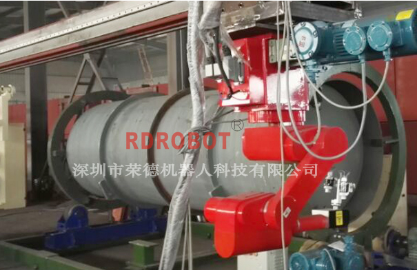 機器人平移行走,配合機架整體前后移動,增大了機器人噴涂范圍,半徑1.3M的機器人就可以把整個產(chǎn)品噴好,適用于大型的、笨重的罐體工件,如下圖所示: