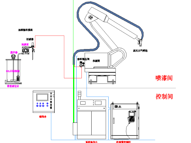 噴漆工位采用機械臂自動噴涂加人工補漆,其中人工補漆面積不能大于5%,應(yīng)保證線上能同時自動噴底漆和自動噴面漆,不允許采用更換油漆管道分不同時段噴底漆或面漆。自動噴涂工位主要配置由噴涂機器人(防爆型,且具有示教功能)、供漆系統(tǒng)(高壓無氣供漆泵及管路,油漆調(diào)漆桶,儲漆桶,氣動攪拌器等)、高壓無氣自動噴槍、人工補漆系統(tǒng)及控制系統(tǒng)等組成。